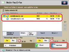 Si <Verrouillage mémoire fax> et/ou <Verrouillage mémoire I-Fax> sont réglées sur "Non", les fichiers reçus via la fonction Fax/I-Fax sont automatiquement imprimés et supprimés de la boîte mémoire RX.