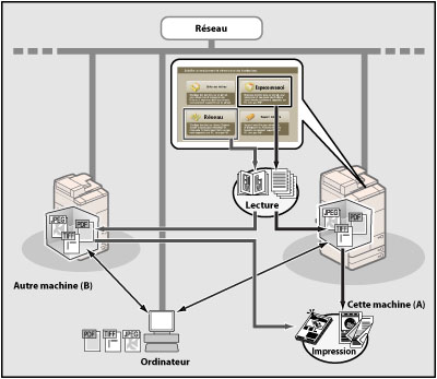 Il est possible de lire un original avec cette machine et de le mémoriser (dans des formats de fichier tels que PDF, JPEG, TIFF ou XPS), et d'imprimer le fichier mémorisé à tout moment en utilisant les réglages d'impression souhaités.