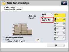 Il est possible de mémoriser des types de papier ne figurant pas dans la liste des réglages détaillés dans <Modif. papier plateau multifonctions : Type papier>. Pour plus d'informations sur la mémorisation du type de papier, voir "Mémorisation/modification des types de papier personnalisés".