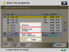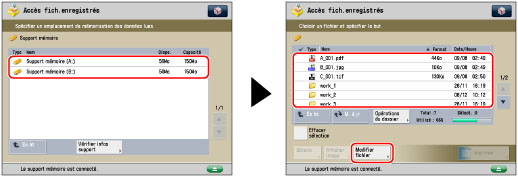 Sélectionner le support mémoire souhaité → sélectionner le répertoire où le fichier sera mémorisé → appuyer sur [Modifier fichier].