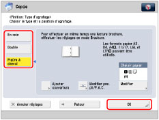 Le mode [Piqûre à cheval] peut être défini uniquement si l'option Copie recto verso est réglée.