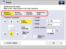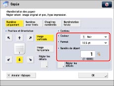 Si le même emplacement d'impression du numéro est sélectionné pour n'importe quelle combinaison de deux modes parmi les suivants : [Numérotation jeux copies], [Filigrane] ou [Date d'impression], un message demandant la confirmation s'affiche lorsque l'on appuie sur