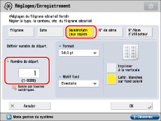Pour plus d'informations sur la saisie des caractères, voir "Saisie de caractères sur l'afficheur tactile". Si des caractères sont mémorisés dans [Enreg. caractères pour Num. pgs/Filigrane] dans [Réglages de fonction] (Réglages/Enregistrement), il est possible de sélectionner les caractères dans la liste.