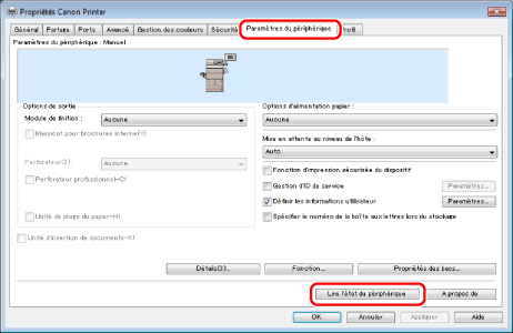 Si l'imprimante et l'ordinateur sont connectés via un port USB ou WSD (Web Services on Devices, services Web sur périphériques), la fonction [Lire l'état du périphérique] n'est pas disponible. Il est nécessaire de configurer les paramètres manuellement.