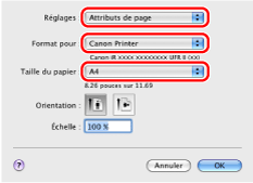Sous Mac OS X 10.5 et ultérieur, il se peut que la boîte de dialogue [Format d'impression] n'apparaisse pas, en fonction de l'application utilisée. Si c'est le cas, spécifier les réglages ci-dessous à partir de la boîte de dialogue [Imprimer] à laquelle on accède par le biais de l'option [Imprimer] du menu [Fichier].