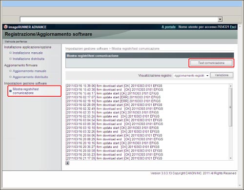 Premere [Impostazioni gestione software] → [Test comunicazione].