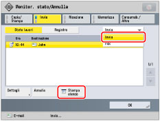 Sull'elenco dei lavori di invio viene stampata una lista delle trasmissioni fax, e-mail, I-fax e file server e mailbox.