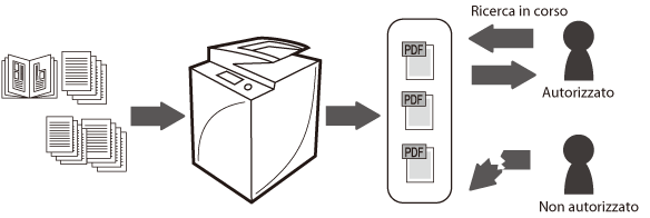 Mediante il modo PDF ricercabile, è possibile convertire documenti cartacei in PDF con testo ricercabile. Ad esempio, è possibile risparmiare spazio digitalizzando i documenti cartacei come un curriculum vitae. La crittografia di file PDF consente di limitare l'apertura dei file e la ricerca di informazioni da parte di utenti non autorizzati. Impostando una password quando si inviano i documenti acquisiti, si può impedire la perdita di informazioni che si verifica quando i documenti vengono inviati alla destinazione errata.