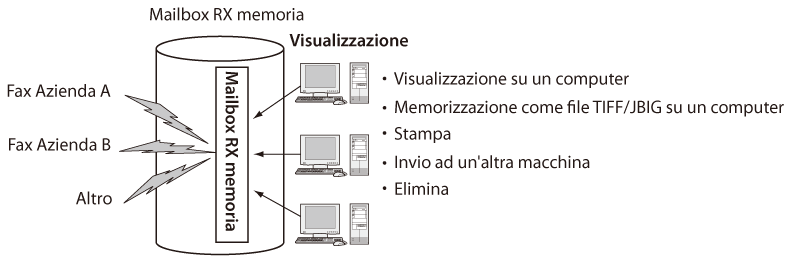 I documenti ricevuti via fax, fax Internet e fax Intranet vengono memorizzati temporaneamente nella Mailbox RX memoria del disco fisso interno della macchina. I documenti ricevuti possono essere elaborati come riportato sotto.