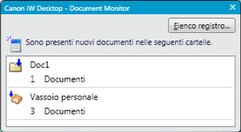 È possibile utilizzare Document Monitor per monitorare le cartelle di destinazione delle hot folder. Configurando le cartelle da monitorare con iW Desktop e abilitando la notifica dei nuovi documenti, quando si trasferisce un documento da una hot folder alla cartella di destinazione appariranno l'icona e la finestra di notifica del nuovo documento.