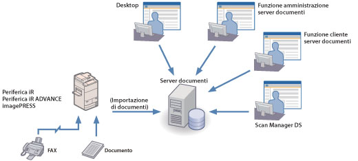 È possibile memorizzare documenti creati con Desktop, come pure documenti digitalizzati mediante macchine Canon e Document Scanner DR Series (scanner documenti) attraverso la rete, nonché creare un sistema avanzato di gestione dei documenti in grado di gestire in maniera efficiente i documenti memorizzati.