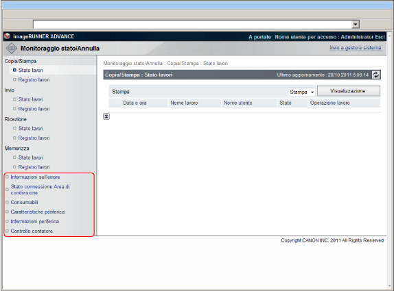 viene indicata la carta residua nelle varie fonti di alimentazione della carta e la disponibilità dei materiali di consumo.