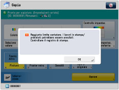 .Il limite al numero di pagine che possono essere generate può essere impostato tra 0 e 999.999 pagine. Una volta raggiunto il limite delle pagine, non è possibile continuare con la copiatura, la scansione o la stampa.