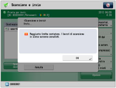 La macchina interrompe la trasmissione di un fax quando viene raggiunto il valore impostato in Limite scansioni durante la trasmissione dalla memoria o la trasmissione diretta al destinatario.