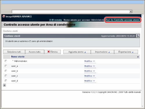 Fare clic su [Esci da Controllo accesso utente] per terminare l'operazione. Se si chiude la pagina del browser senza fare clic su [Esci da Controllo accesso utente], il processo di disconnessione non verrà eseguito correttamente. In questo caso, si noti che non sarà possibile accedere nuovamente per circa 30 minuti.