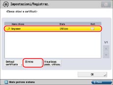 Le coppie di chiavi per cui 'Utilizzo' viene visualizzato in <Stato> non possono essere eliminate perché sono in uso con l'autenticazione IEEE802.1X/con IPSec o perché SSL è impostato su 'On'. Premere [Visualizzaz. posiz. utilizzo] per controllare il tipo di protezione per cui è utilizzata la coppia di chiavi. Per eliminare una coppia di chiavi utilizzata solo con SSL, specificare le seguenti impostazioni su 'Off'. Una coppia di chiavi utilizzata per l'autenticazione IEEE802.1X/per IPSec non può essere eliminata.
