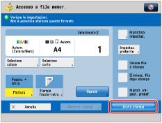 Per stampare un file memorizzato sulla macchina con un computer o con [Memorizz. in mailbox] della funzione Copia con le impostazioni configurate durante la memorizzazione del file, non stampare il file dalla schermata Variaz. impostaz. stampa. Se si stampa dalla schermata Variaz. impostaz. stampa, il file potrebbe non essere stampato con le stesse impostazioni configurate durante la memorizzazione del file.