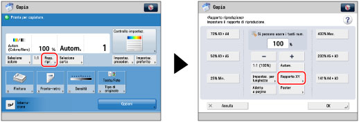 Se si imposta [Rapporto XY automatico], selezionare il formato carta mediante il modo Selezione manuale carta. Se non si seleziona un formato carta, viene selezionato automaticamente il cassetto 1 e il rapporto di riproduzione viene impostato in base al formato della carta caricata in quel cassetto.