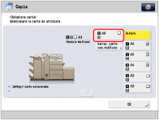 Se per il lavoro in corso la stampa viene alimentata dal vassoio multiuso, per il lavoro successivo è possibile selezionare la carta da [Variaz. carta vas.multiuso]. (Vedere "Prenotazione di lavoro copiatura mediante il vassoio multiuso".)