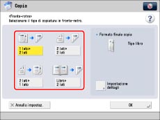 2 lati], seguire le istruzioni visualizzate sulla schermata per eseguire la scansione di ciascun lato degli originali.Se si intende posizionare l'originale fronte-retro sul vetro di lettura per copiare nel modo [2 lati