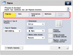 Il testo inserito in [Personalizz.] non viene salvato automaticamente. Se si utilizza [Filigrana di sicurezza], per registrare la filigrana di sicurezza appena creata in modo da poterla selezionare ogni volta che occorre, selezionare [Registra] → immettere il testo da registrare.