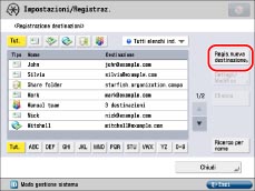 Premere [Impostazione destinazione] → [Registrazione destinazioni] → [Regis.nuova destinazione].