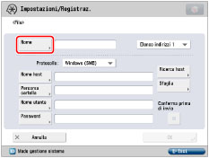 Per le istruzioni su come specificare ciascuna impostazione per FTP, Windows (SMB) e WebDAV, vedere "Specifica di un file server con la tastiera".