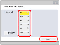 Per selezionare un formato carta in pollici, premere [Dimensioni in pollici].
