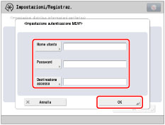 [Nome utente]: Premere [Nome utente] → immettere il nome utente da utilizzare per l'autenticazione → premere [OK].