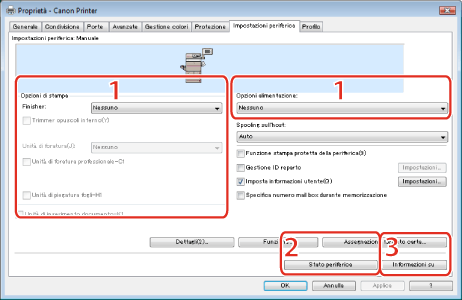 È possibile richiamare le informazioni sulla periferica e aggiornare le impostazioni visualizzate nella scheda (vedere "Impostazione delle opzioni della stampante").