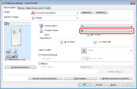 Selezionare il formato pagina del documento creato nell'applicazione da [Formato pagina].
