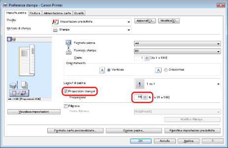 Per aumentare o diminuire manualmente l'ingrandimento, selezionare [Proporzioni manuali] → specificare il valore percentuale delle proporzioni per [Proporzioni].