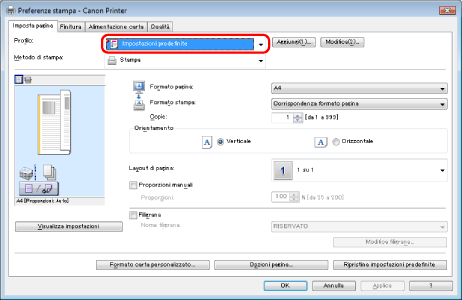 Se non si riesca a selezionare un profilo, visualizzare la finestra di dialogo delle proprietà della stampante da [Pannello di controllo] a fare clic sulla scheda [Profilo], quindi controllare se le opzioni [Consenti selezione profilo] e [Consenti modifica impostazioni] sono selezionate. Per informazioni dettagliate su come visualizzare la finestra di dialogo delle proprietà della stampante, vedere " Impostazione delle opzioni della stampante".