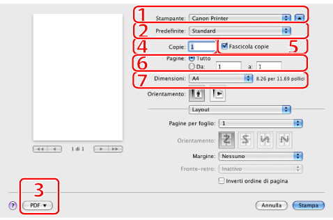 ], a destra di [Stampante], per visualizzare tutte le impostazioni nella finestra di dialogo [Stampa].Se le funzioni riportate sopra non possono essere configurate nella parte superiore della finestra di dialogo [Stampa], visualizzarle e impostarle nel riquadro preferenze [Copie e pagine] o nella finestra di dialogo [Formato di stampa].