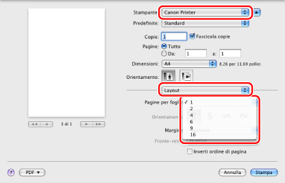 Selezionare la stampante → [Layout] → da [Pagine per foglio] selezionare il numero di pagine da stampare in un foglio.