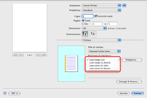 Selezionare la stampante → [Finitura] → selezionare [Stampa su un lato] o [Stampa fronte/retro] da [Stile di stampa].