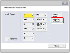 → Geben Sie die richtigen Werte ein.Die Formattasten ([S1] - [S5]) können erst dann verwendet werden, wenn sie zuvor mit einem Sonderformat programmiert wurden. Nähere Informationen zum Speichern von Sonderformaten finden Sie im Abschnitt "Speichern/Bearbeiten/Löschen anwenderdefinierter Papiertypen".