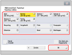 Sie können Papiertypen speichern, die nicht in <Detail. Einstell.> für die Auswahl des Papiertyps aufgeführt sind. Nähere Informationen zum Speichern eines benutzerdefinierten Papiertyps finden Sie im Abschnitt "Speichern/Bearbeiten anwenderdefinierter Papiertypen".