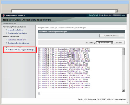 Berühren Sie nacheinander die Tasten [Einstellungen Software-Verwaltung] → [Log-Anzeige wählen] → [Aktualisierte Logs anzeigen].