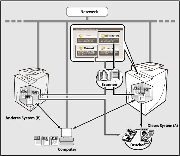 Sie können von imageRUNNER ADVANCE eingelesene Originale im Dateiformat PDF, JPEG oder TIFF speichern, oder Dateien vom imageRUNNER ADVANCE ausdrucken.