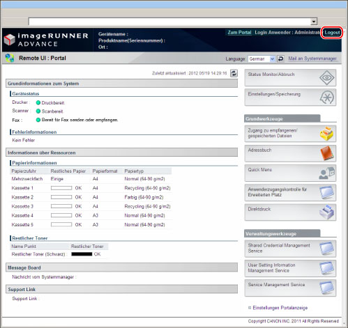 Wenn Sie den Vorgang abgeschlossen haben, berühren Sie die Taste [Logout] oder betätigen die Taste