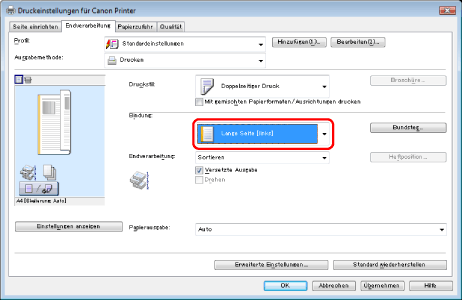 Die Standardeinstellung für [Druckstil] ist [Doppelseitiger Druck]. Sie können die Standardeinstellung auch in [Einseitendruck] ändern. Die Anleitung zum Ändern der Standardeinstellungen finden Sie unter "Konfigurieren der Standard-Druckeinstellungen".