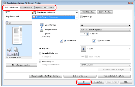 Klicken Sie auf die Registerkarten [Seite einrichten], [Endverarbeitung], [Papierzufuhr] und [Qualität], und legen Sie die gewünschten Einstellungen fest.