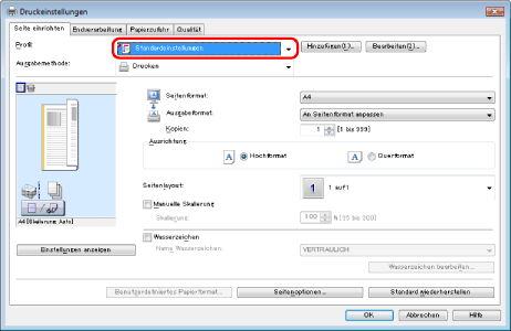 Kombinationen von Druckertreibereinstellungen für eine Vielzahl von Druckzwecken stehen im Druckertreiber als "Profile" zur Verfügung. Damit können Sie Dokumente entsprechend einem gewünschten Ziel ausdrucken, indem Sie einfach ein Profil aus der Liste [Profil] auswählen.
