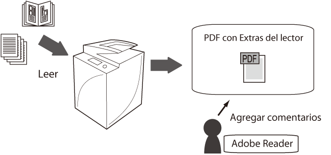 Si selecciona el modo Extras del lector cuando convierta un documento de papel a archivo PDF, podrá agregar/editar comentarios, y agregar firmas utilizando Adobe Reader (Adobe Reader 7 o posterior).