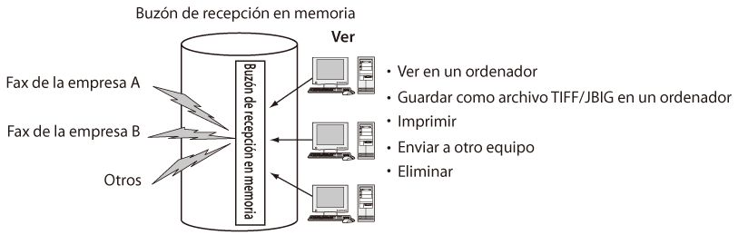 Los documentos recibidos vía fax, fax por Internet, y fax por Intranet se guardan temporalmente en el Buzón de RX en memoria del disco duro interno del equipo. Los documentos recibidos podrán procesarse como se muestra a continuación.