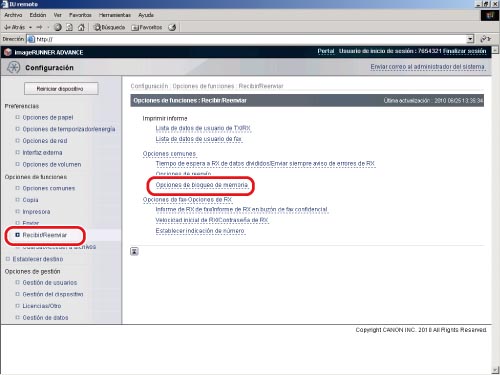 Acceda a la IU remota → haga clic en [Configuración] → [Recepción/Reenvío] para <Opciones de funciones> → [Opciones de bloqueo de memoria].