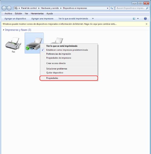 En la carpeta [Impresora] (o la carpeta [Dispositivos e impresoras]) haga clic con el botón derecho en el icono de la impresora cuyas opciones desee especificar → haga clic en [Propiedades] (o [Propiedades de impresora]).