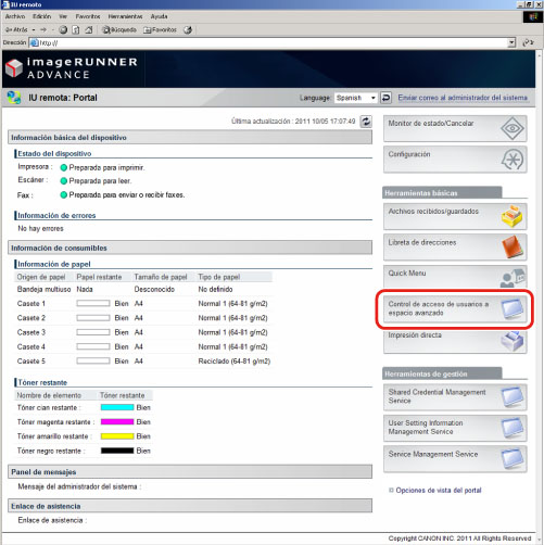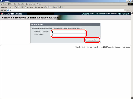 Inicie la IU remota → introduzca la siguiente URL en el navegador web → haga clic en [Sesión administrador].