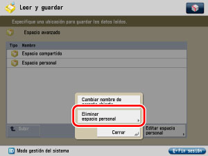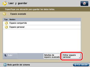 Pulse [Leer y guardar] o [Archivos guardados] en la pantalla Menú principal → pulse [Espacio avanzado].